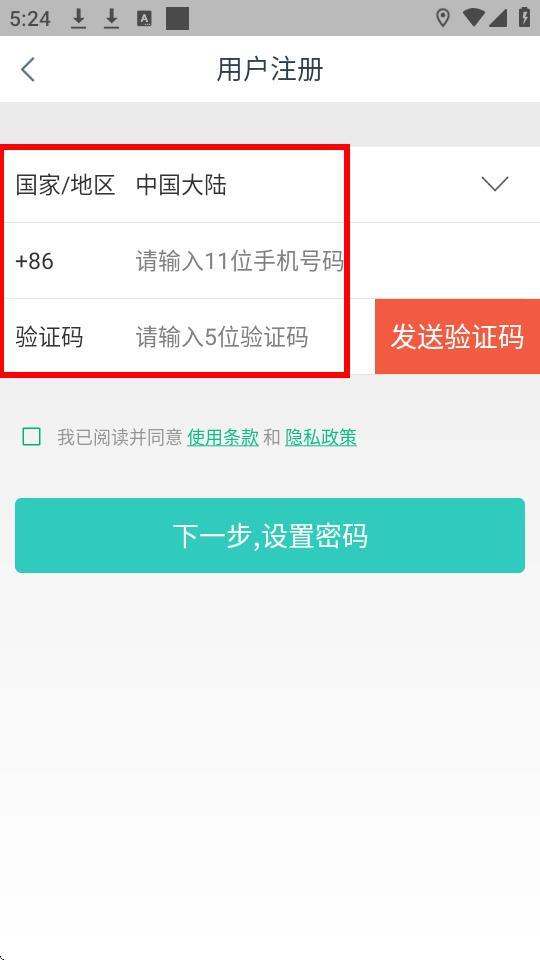 4、用户注册时,需先输入11位手机号码,获取并填写5位验证码,同时勾选同意相关条款,完成这些操作后即可进入下一步设置密码的环节。