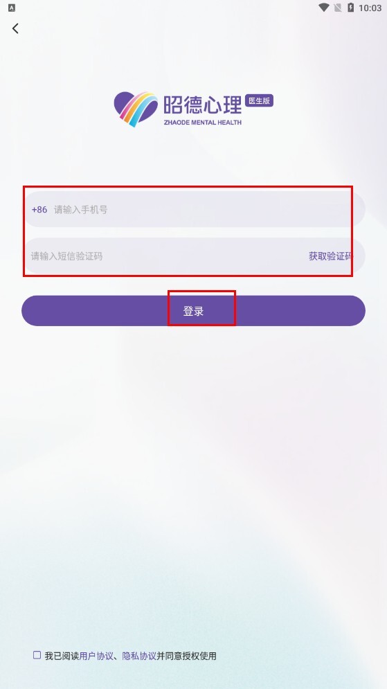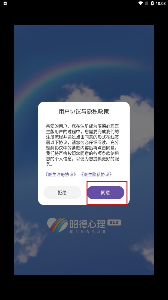 1、阅读《用户协议与隐私政策》后,点击【同意】,接受条款以继续使用昭德心理医生版。