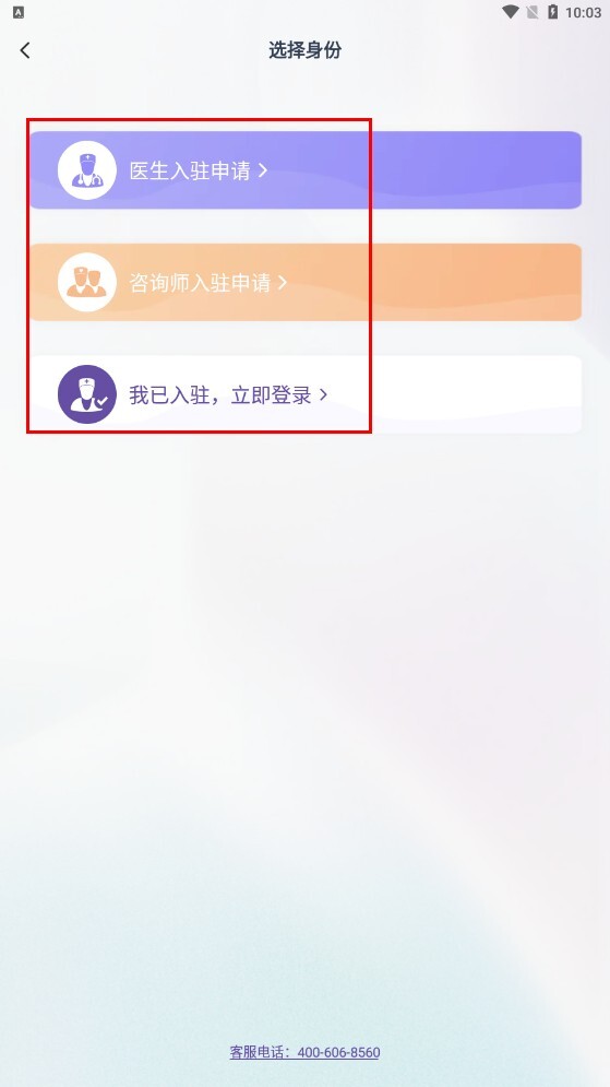 3、请依据自身实际情况,选择【医生入驻申请】【咨询师入驻申请】或【我已入驻,立即登录】,以推进账号注册或登录的相关流程。