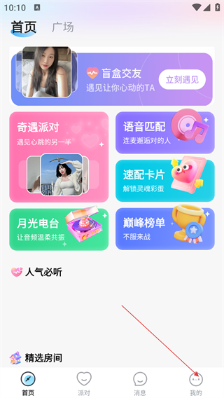 1、进入该社交类App首页,可使用盲盒交友、语音匹配等社交功能。