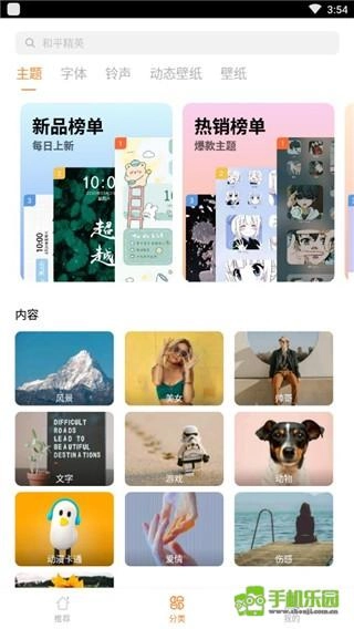 4、点击分类按钮,即可按类别浏览资源。除主题外,还包含字体、铃声、动态壁纸等多种类型的资源。