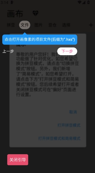 3、切换到文件功能菜单上就可以导入画像素的项目文件(.hxs)