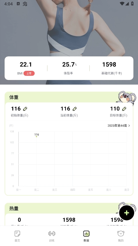1、安装该的最新版,打开进入输入好你的身体体脂数据及目标等。