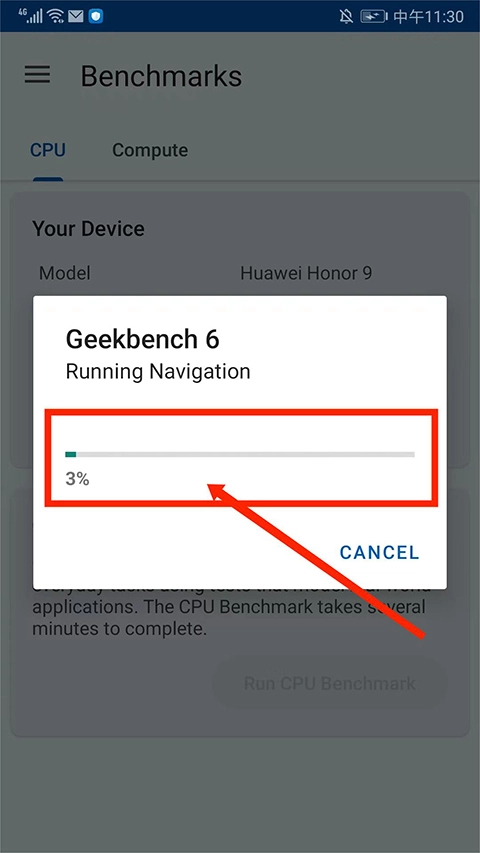 2、进入应用主界面,该界面包含【CPU】与【Compute】两个栏目,接着在CPU栏目中找到右下角的【Run CPU Benchmark】选项并点击,以此运行cpu基准测试。