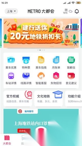 1、在本站下载并安装上海地铁大都会应用,打开软件进入首页后,就能查看各项功能