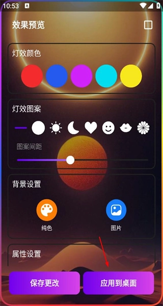 4、返回效果预览页,可看到背景已更新,确认设置后点击应用到桌面,完成灯效背景的配置。