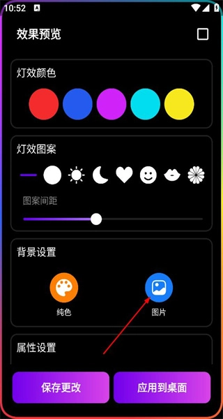 1、启动软件后,进入效果预览页面,能对灯效的颜色、图案等进行设置,接着点击背景设置中的图片选项,即可进入照片选择界面。