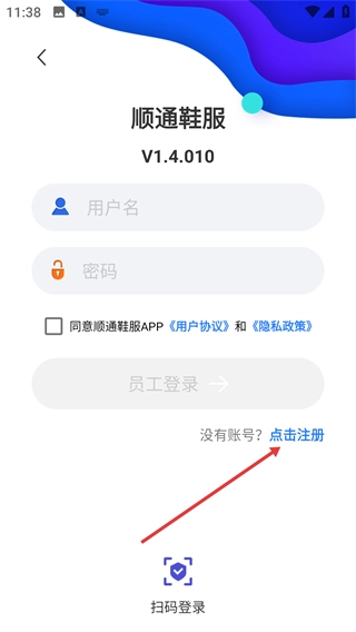 2、进入【顺通鞋服-V1.4.010】登录页,若暂无账号,点击【点击注册】按钮进入员工账号注册页面。