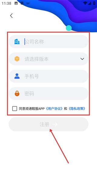 3、在注册页,依次填写【公司名称】【手机号】等信息,选择对应版本并设置密码,勾选相关协议。