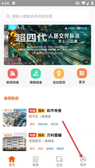 进入房产软件首页后,能使用【新房报备】【活动签到】等功能,点击底部的【我的】按钮,进入个人中心页面为后续操作做准备。