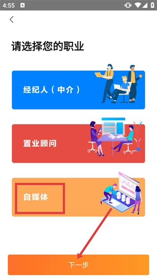 3、进入注册的职业选择页面,选中【自媒体】职业选项后,点击底部【下一步】按钮,进入信息填写界面。