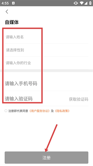 4、在【自媒体】注册信息页,填写【姓名】【性别】等信息并获取验证码,勾选协议后点击【注册】完成账号注册。