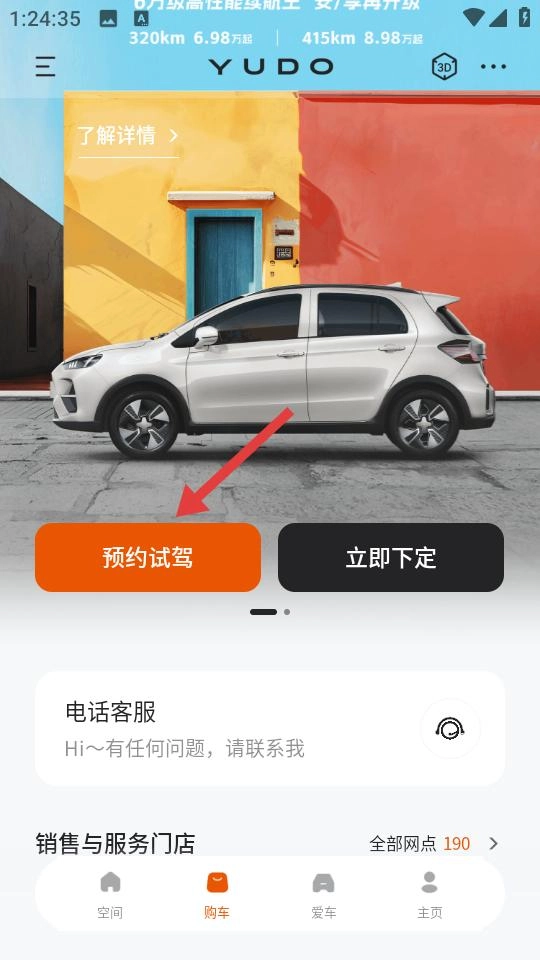 1、购车页面展示车型外观,设预约试驾、立即下定按钮,搭配电话客服入口、门店查询,方便用户了解车型、预约体验或直接下定,推进购车流程。