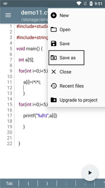 2、将需要运行代码输入,点击文件夹标识,选择“Save as”,给c文件命名并保存,注意文件的后缀填写。