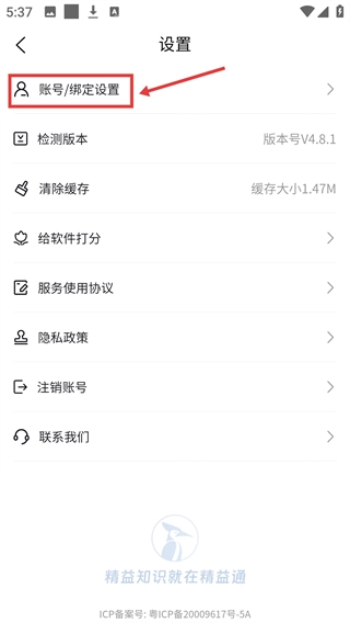 3、进入【设置】页面后,找到并点击【账号/绑定设置】选项。
