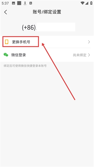 4、进入【账号/绑定设置】页面后,点击【更换手机号】选项可进行手机号更换操作。