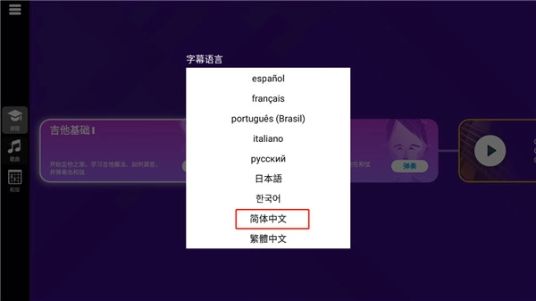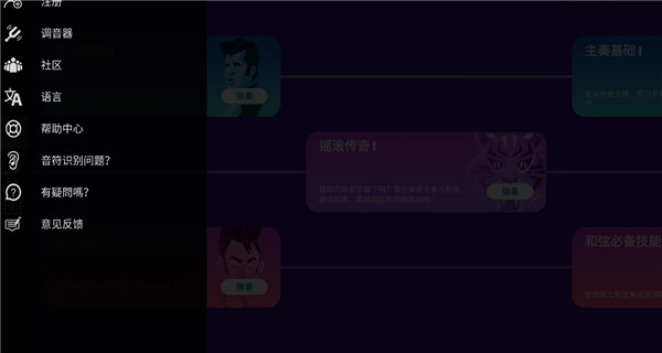 7、点击左上角,我们可以自行设置语言、调音器等功能,也能进入社区与其他吉他爱好者共同学习。