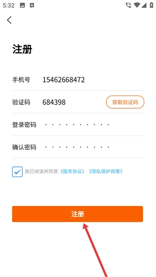 4、在注册页面填写【手机号】【验证码】,设置并确认密码后点击【注册】按钮完成账号注册。