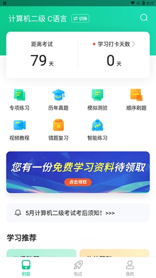 1、计算机二级通关宝典软件设有考试选择功能,提供四个不同的计算机二级考试选项供用户挑选。 2、选定考试后,界面会显示距离考试的倒计时,以提醒用户考试时间,同时还会展示学习打卡天数。在这些信息下方,用户可选择专项练习、历年真题、模拟测试、顺序刷题、视频教程等相应功能来开展备考训练。