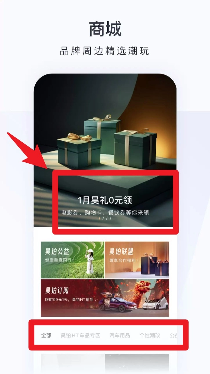 3. 在商城中可领取福利礼包、兑换商品,并通过分类入口快速浏览汽车用品、个性潮改等专区。