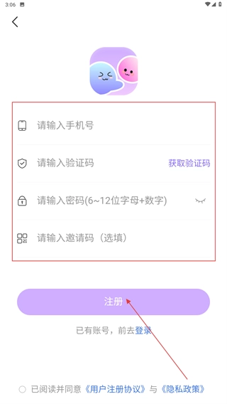4、若需注册账号,在注册页面填写手机号、验证码等信息后,点击【注册】完成账号创建。