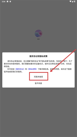 1、在服务协议与隐私政策页面,点击【同意并接受】按钮,确认相关条款后即可进入应用。