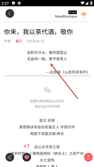 2、在资讯列表中,点击【你来,我以茶代酒,敬你】文章条目,可进入该文章的详情阅读页。
