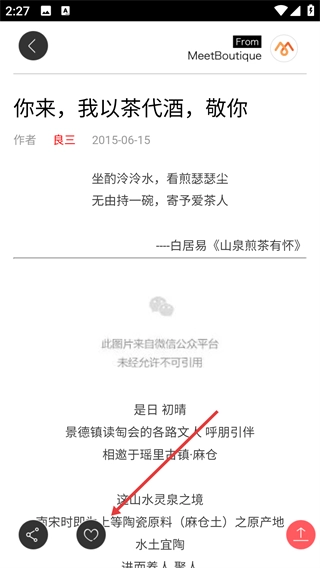 3、在文章详情页,点击底部心形图标,可完成对该文章的点赞操作,标记感兴趣的内容。