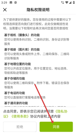 1、进入隐私权限说明页面后,仔细阅读权限相关说明,随后点击“同意”按钮,即可进入密码登录界面。