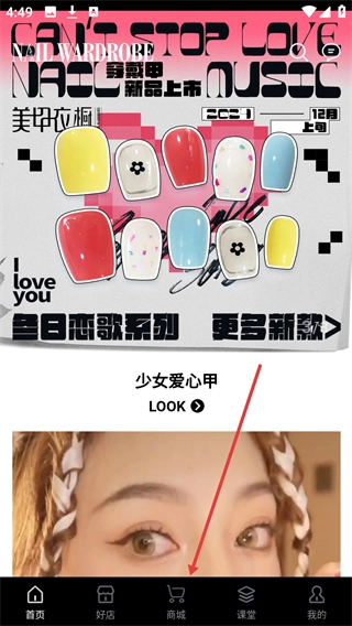 1、在美甲服饰类应用的首页,点击底部的【商城】选项,就能进入美甲商品的分类展示页面。