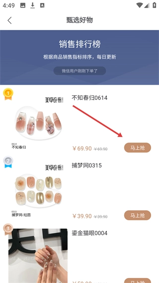 3、在销售排行榜页面,可查看按销量排序的美甲商品,点击商品对应的【马上抢】按钮可进入商品详情页。