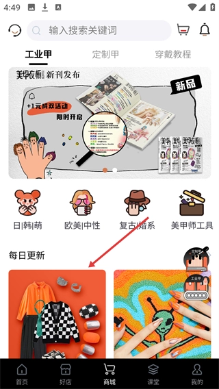 2、在商城页面,可查看不同风格的美甲分类及每日更新的商品推荐,点击目标商品区域可进入销售排行榜。
