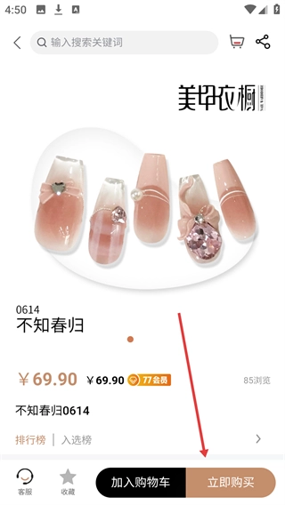 4、在商品详情页,可查看美甲款式、价格等信息,同时使用【加入购物车】【立即购买】等功能完成下单。