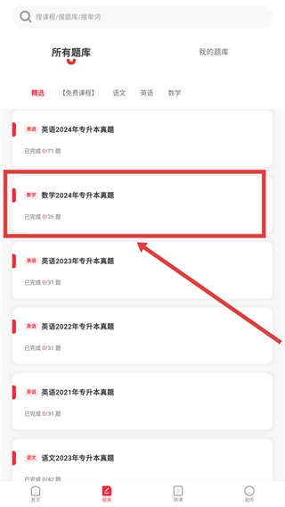 2、在【所有题库】页面,选择目标学科的真题(如【数学2024年专升本真题】),进入该套真题的练习界面。
