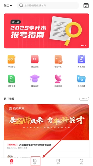 1、打开西培教育App的首页后,点击底部的【题库】按钮,页面会切换到题库界面,在该界面中可以挑选不同学科的真题进行练习。