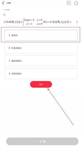 3、在真题答题界面,选择对应选项(如本题选A),点击【提交】按钮,完成该题的作答并查看结果。