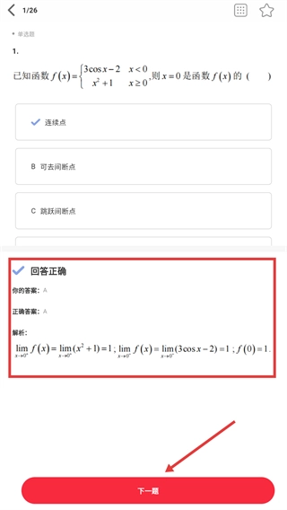4、答题结果显示【回答正确】后,可查看解析内容,再点击【下一题】按钮,继续完成剩余题目练习。