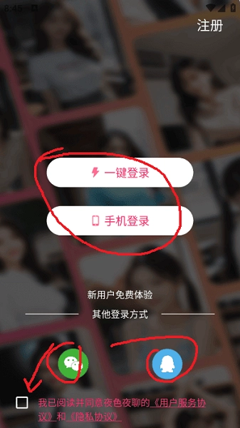 2、然后进入登录界面,手机一键登录,还能qq微信,没有账号需要注册一下。
