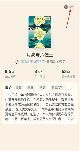 4、进入书籍详情页,查看简介评分等信息,点击听书按钮,可开启该书的听书模式。