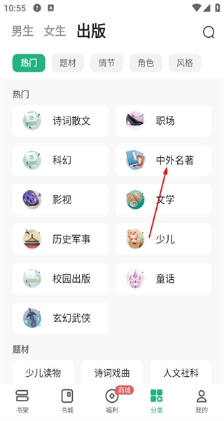打开软件后,进入分类页面,能看到热门等题材分类,点击中外名著选项,即可进入对应的分类页面。