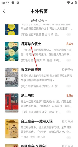 3、在筛选后的书籍列表中浏览多部中外名著,选择月亮与六便士,进入该书详情页面。