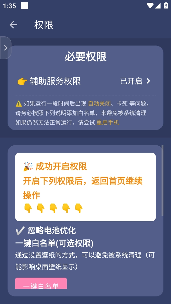 你需要把贝利自动点击器的电池优化关掉,不要限制后台,并且开启自动启动权限,来避免被系统清理掉。