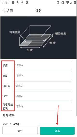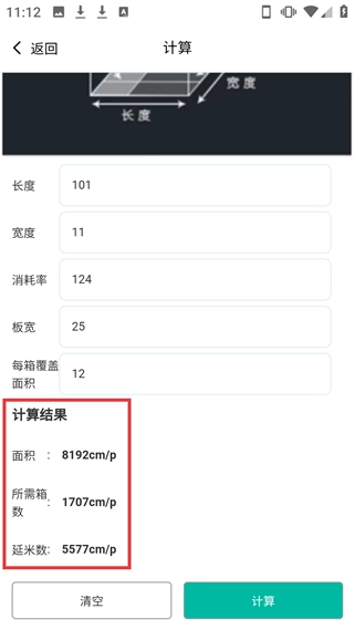 4、填写完参数后点击【计算】按钮,获取对应的面积、所需箱数等计算结果。