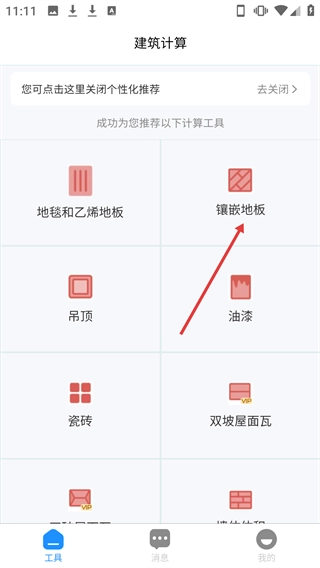 2、在建筑计算工具页面点击【镶嵌地板】选项,进入该工具的计算页面。