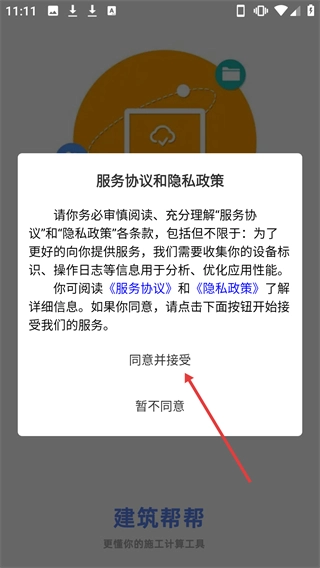1、在【服务协议和隐私政策】弹窗里点击【同意并接受】按钮,即可进入建筑计算工具页面。