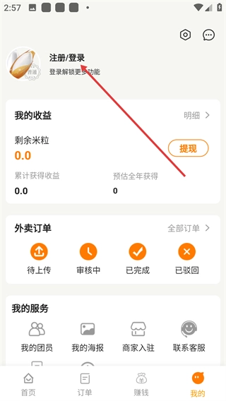 2、进入个人中心,可查看【我的收益】【外卖订单】状态,点击【注册/登录】可解锁更多功能,还能使用【我的服务】相关工具。