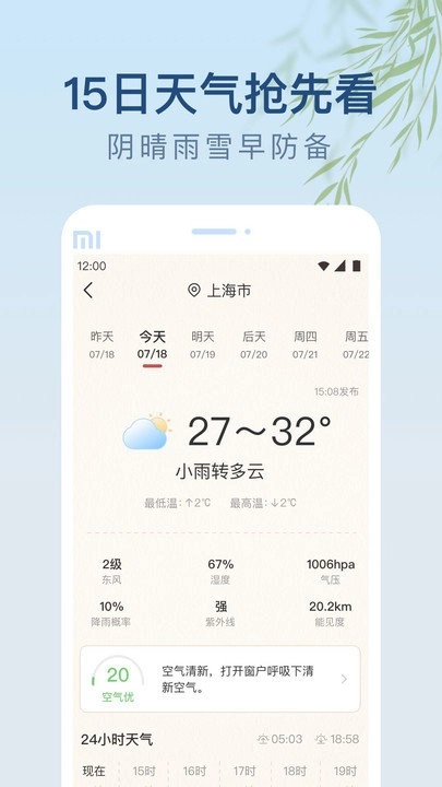 提供全国实时、24小时及15天预报,用户可查看详细气象信息。