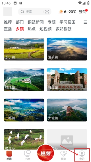 1、进入展示永宁镇、温泉镇等乡镇内容的界面后,点击底部的“我的”选项,进入个人功能页面。