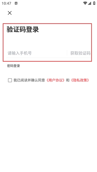 3、进入登录流程后,呈现【验证码登录】界面,可填写【请输入手机号】并点击【获取验证码】,也能切换至【密码登录】。