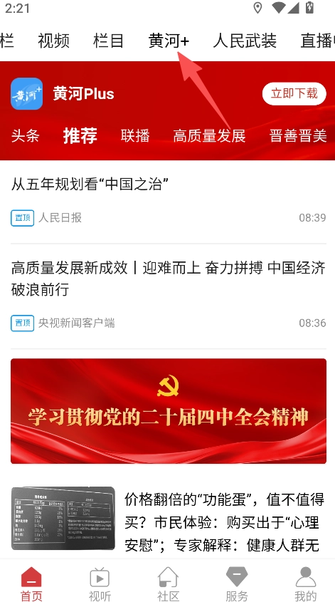 1、具备板块浏览功能,进入黄河+板块,查看头条推荐等分类下的资讯列表信息。